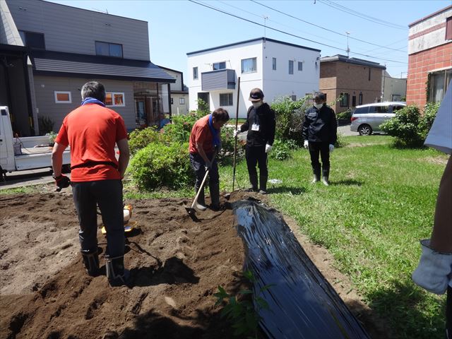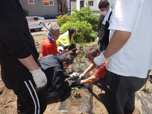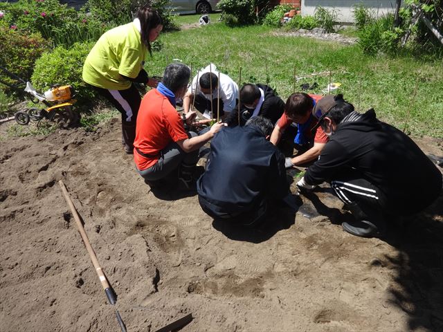 事業所の近くにある知人の庭を借りて、ジャガイモをたくさん植えました。作業が終わってから皆でお菓子とお茶を頂きました。たくさん芋が取れるといいな!