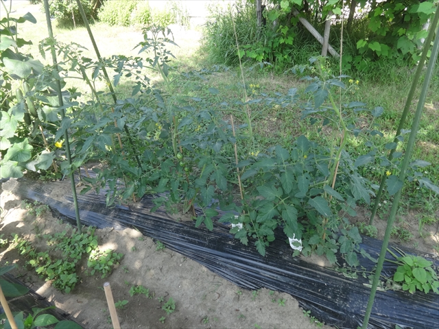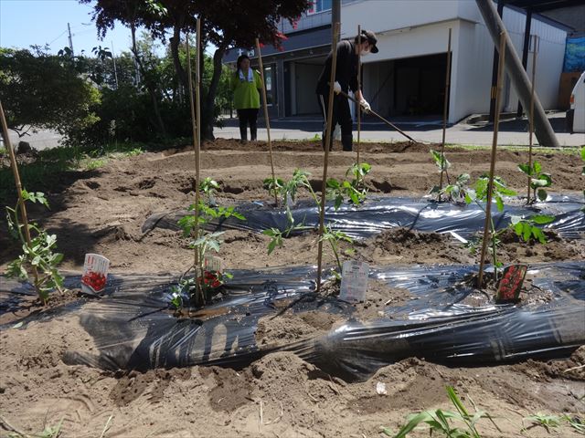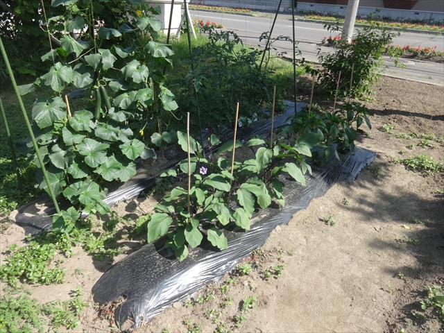 マルチを貼って、キューリ・なす・トマトなどを植えました。